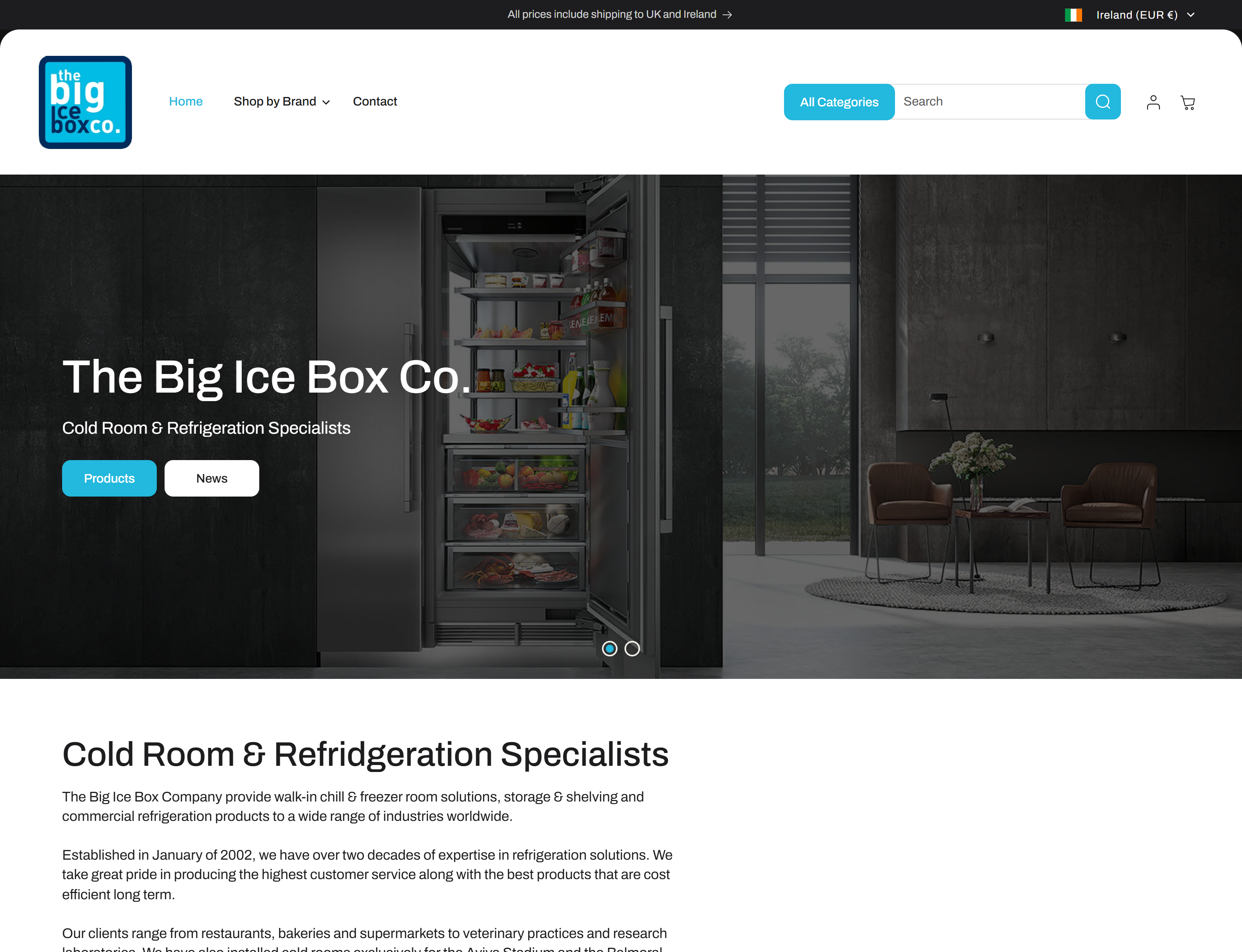 This website is a business to business or “trade” website. Shopify is very good at B2B and Big Ice Box use Shopify to handle complex cross border VAT arrangements, pallet shipping, local market pricing, invoices with credit terms, and lots more. But the beauty of the website is that if a consumer wants to buy a Liebherr fridge then the website will sell it to them – no harm. Imagine waking up at 8am on a Sunday morning and finding that you sold a €900 fridge while you slept. That’s the power of a great e-commerce website.