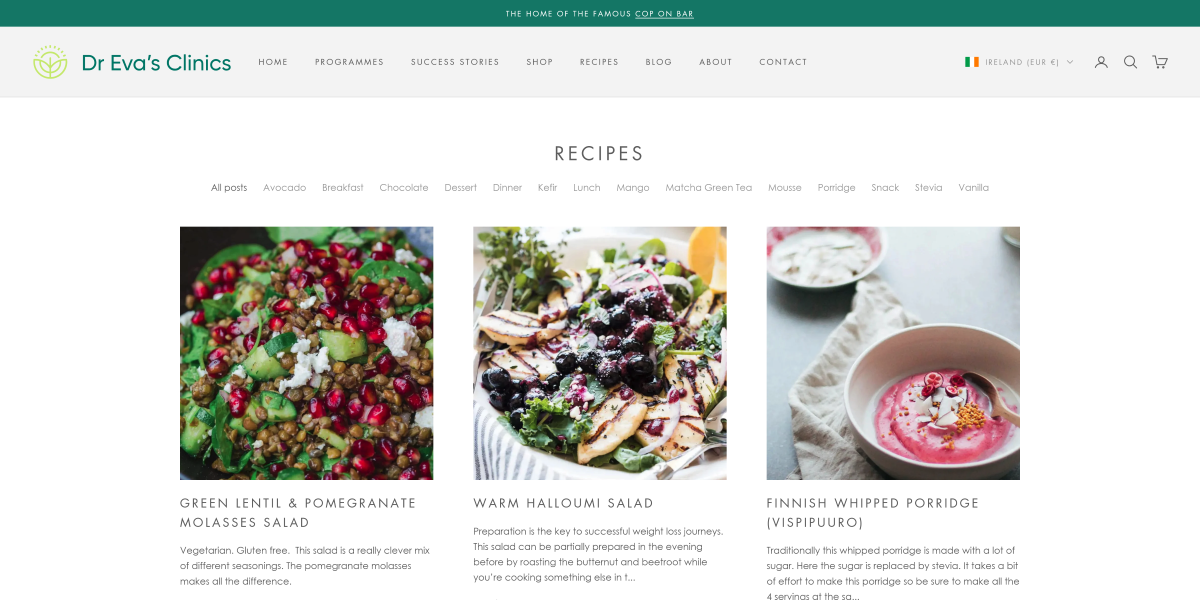 We were summonsed to a meeting, and we were grilled like never before. We had to spend a long afternoon explaining that you could have blog posts in Shopify, you could edit your own pages in Shopify, you could upload PDFs to Shopify, etc. We must have said the right things as the next day we got the go ahead to migrate Dr Eva’s Clinics webpage from WordPress to Shopify and of course to add a shop and other functionality.